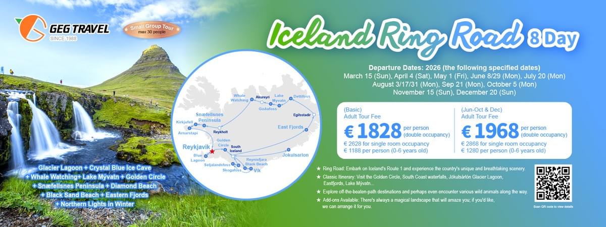 - Regarding optionalactivities in the Iceland itinerary: Registration is subject to on-site confirmation. Early registration does not guarantee success. Early registration will allow us to reserve a spot in advance, increasing the chances of success. (Some programs are not suitable for guests under 6 years old, those with a fear of heights, asthma, high blood pressure, low blood pressure, panic disorder, or other cardiovascular conditions.)
