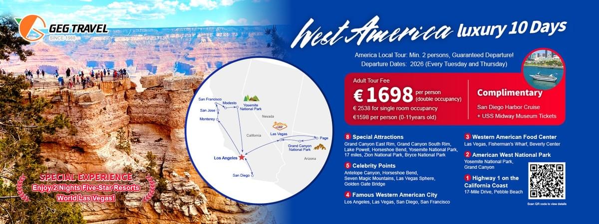 America Local Tour : West America luxury 10 days “ Las Vegas Enjoy 2 Nights Five-Star Hotel !